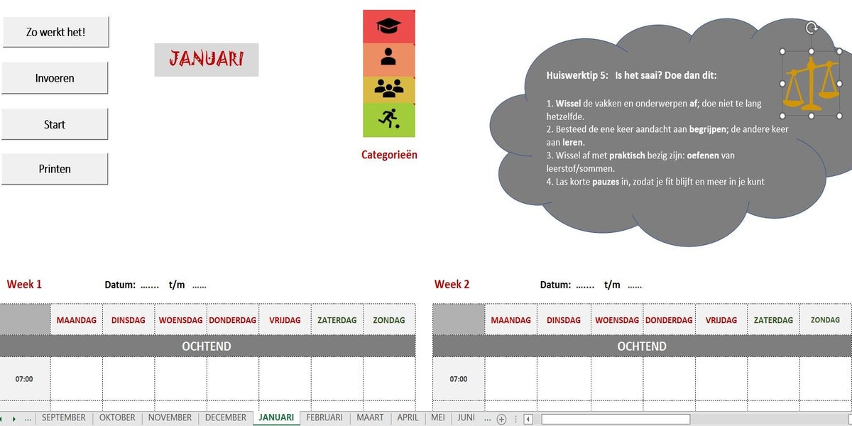 Via de centrale invoer, komt de info direct in de juiste maand, week en tijd in de planner terecht. En fijn: je herkent de activiteiten meteen aan de kleuren. Zo zie jij snel wanneer je wat moet doen, voor welk vak + met wie. Eindelijk goed overzicht!