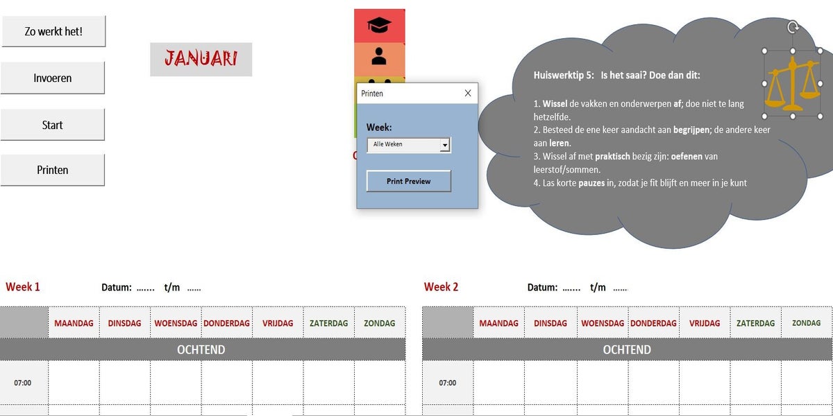 Mét ingebouwde snel printknop om een week/alle weken uit te printen en op te hangen.