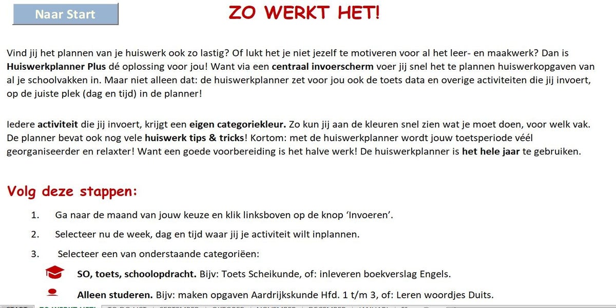 De Huiswerkplanner Plus is dus veel goedkoper dan papieren agenda's die je ieder jaar weer moet aanschaffen. Bestel hem eenvoudig via de winkelwagen. Ga ook voor de perfecte huiswerkplanning en dus voor goede cijfers én weer plezier in school!
